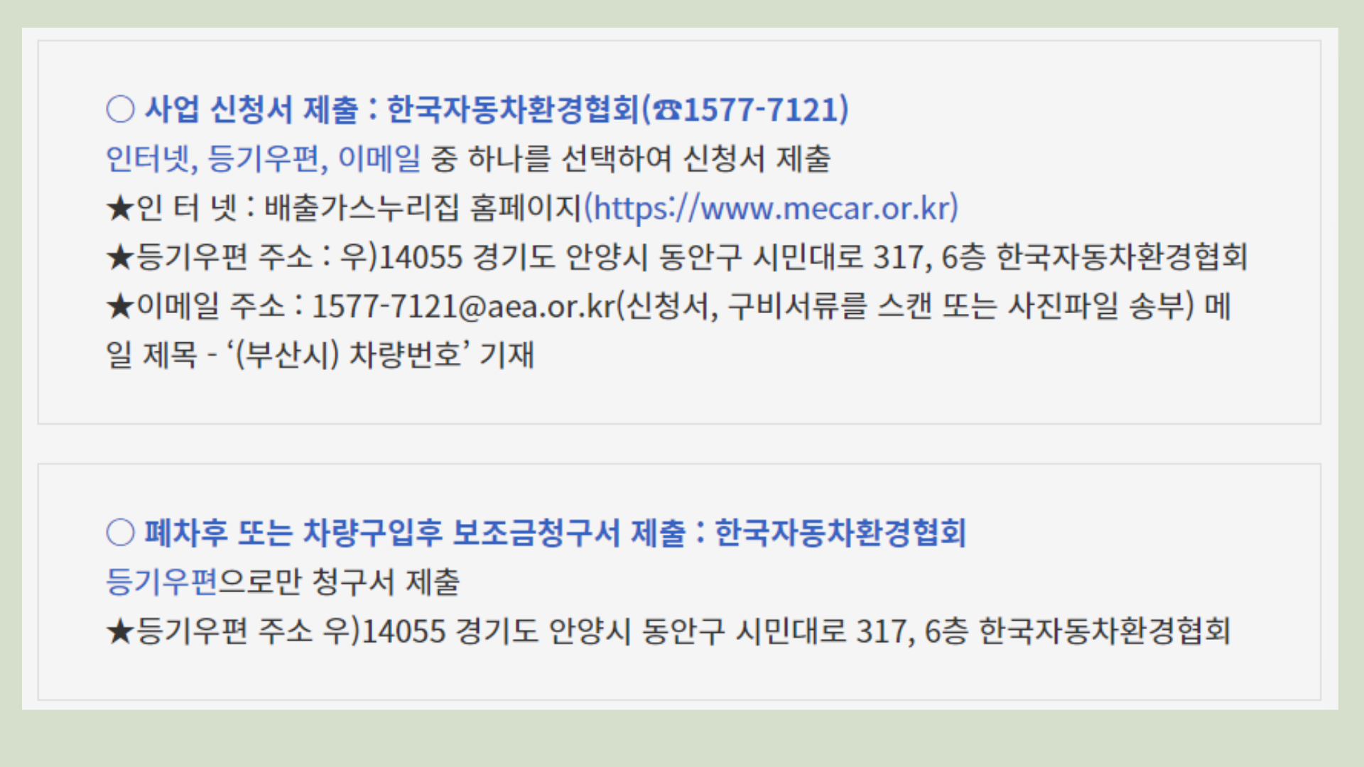 조기폐차 지원사업은 사업신청서 및 보조금 청구서 모두 한국자동차 환경협회에 접수해야 합니다!