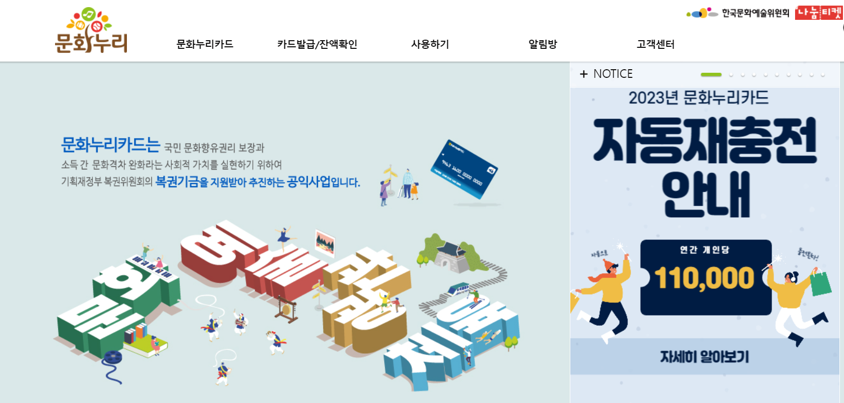 2022년 문화누리카드 발급자가 수급자격 유지 시, 별도의 신청 절차 없이  자동으로 2023년 지원금(11만 원)을 개인의 문화누리카드로 지급됩니다.
