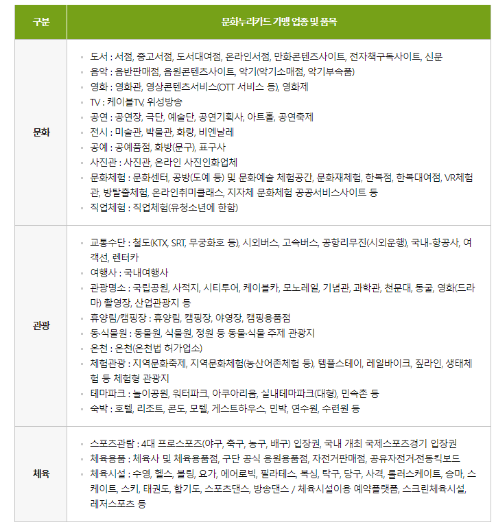 공연, 영화, 전시 관람을 비롯해 국내 여행, 4대 프로스포츠 관람(축구, 농구, 야구, 배구)등 문화예술, 여행, 체육의 다양한 분야에서 사용하실 수 있습니다.