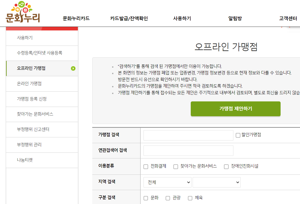 문화누리카드 홈페이지에서 오프라인과 온라인 가맹 업종을 알아볼 수 있습니다.