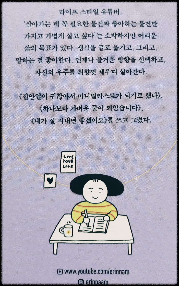 ‘취향이 확실한 사람이 매력적이다’는 이야기가 통용되고, 취향으로 돈을 벌거나 콘텐츠를 큐레이션하는 일명 ‘취향 존중의 시대’. 그러나 의외로 “내 취향을 모르겠어!” 혹은 “내가 좋아하는 건 보잘것없어서 남들에게 보여 주기 부끄러워!”라고 말하는 사람이 많다. 그런 이들을 위해, 인기 라이프 스타일 유튜버 에린남이 물욕보다 매력적인 ‘진짜 취향’을 찾고, 좋아하는 것으로 자신의 우주를 채워가는 기쁨에 대해 이야기한다.