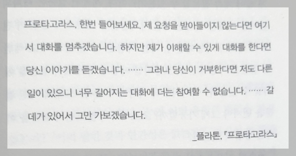 소크라테스는 프로타고라스와 대화할 때 대화 상대가 이해할 수 없는 독백은 하지 말라고 요구했다.