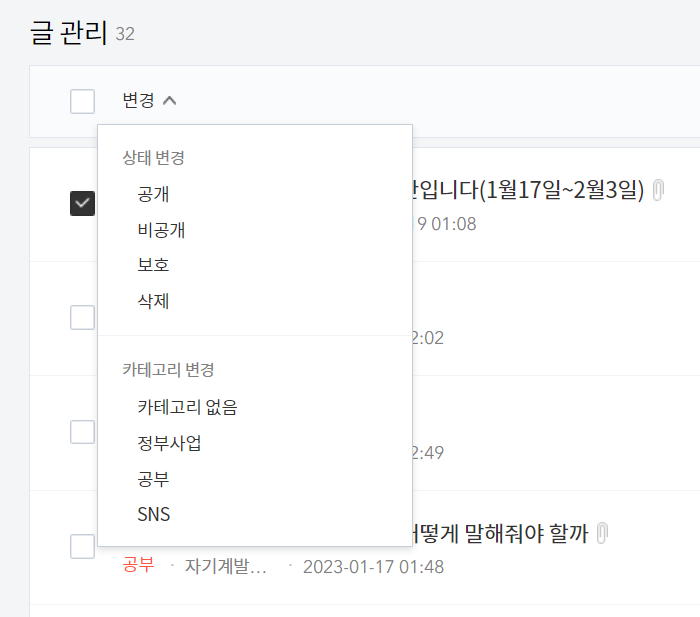이동시키고 싶은 글 체크 한 후 변경 누르고 옮기고자 하는 카테고리 누르기