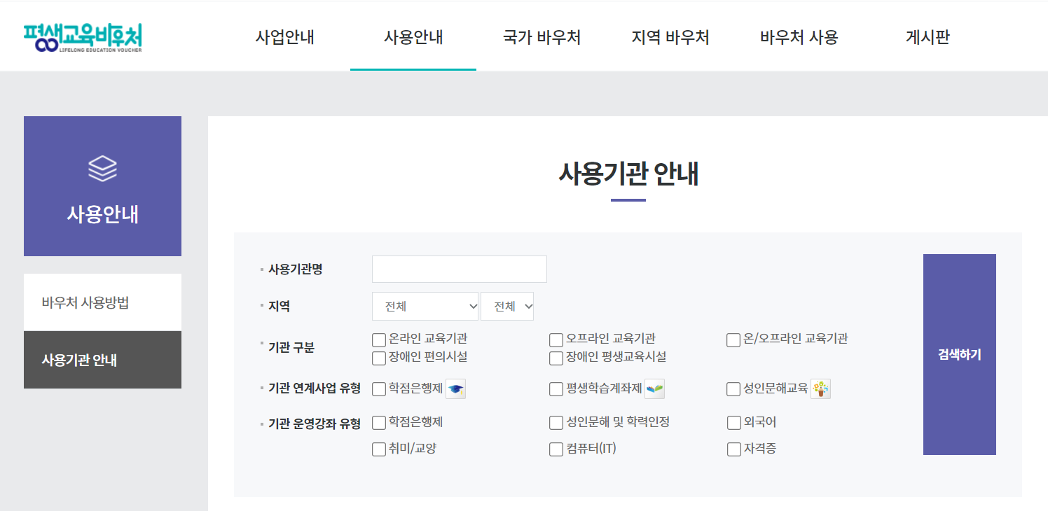 평생교육바우처 홈페이지에서 이용가능 기관을 검색하거나 유형별 검색을 통한 기관 찾기가 가능합니다.