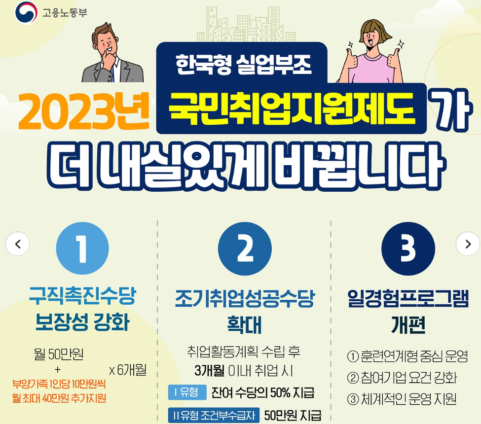 2023년 한국형 실업부조 국민취업지원제도가 더 내실 있게 바뀝니다.